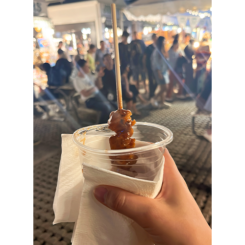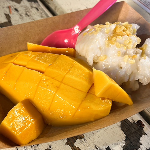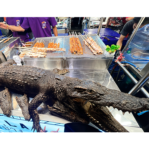 After that, we tried mango sticky rice and crocodile meat skewers, which I had been curious about.