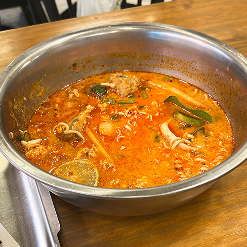 The tom yum noodles were delicious but very spicy.